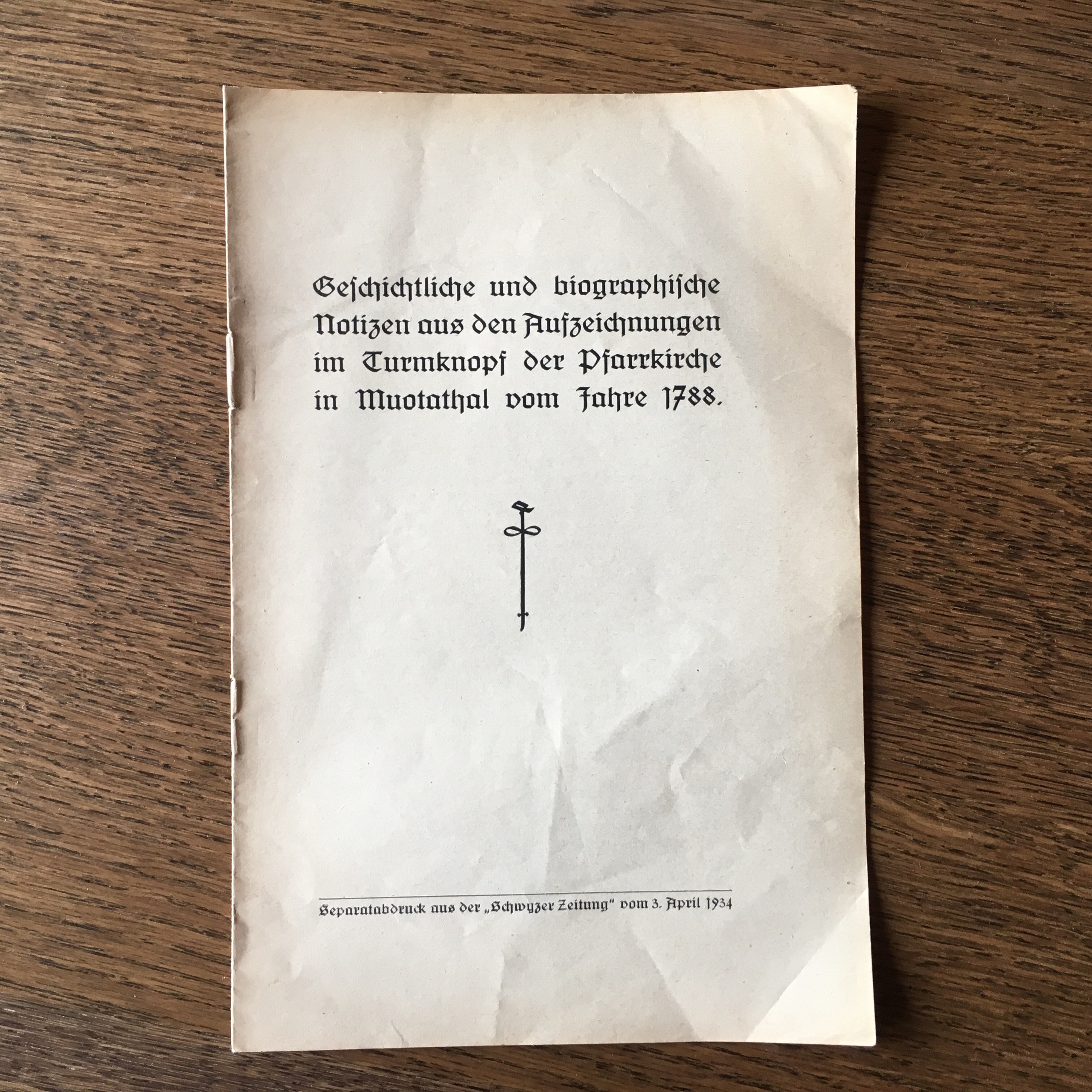 Geschichtliche und biographische Notizen aus den Aufzeichnungen im Turmkopf der Pfarrkirche in Muotathal vom Jahre 1788
