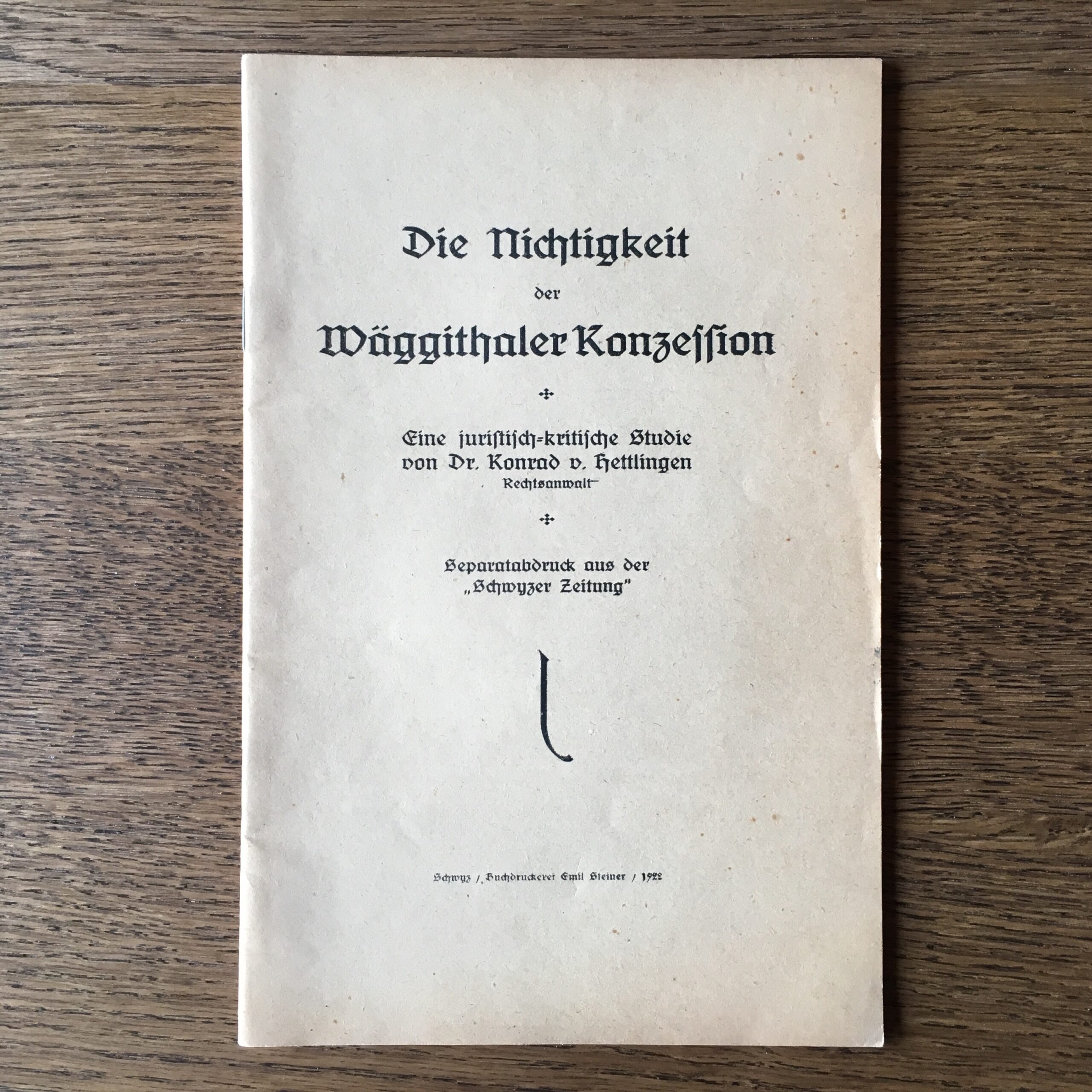 Die Nichtigkeit der Wäggithaler Konzession, Eine juristisch-kritische Studie von Dr. Konrad von Hettlingen, Separatabdruck aus der Schwyzer Zeitung 1922, 29 Seiten